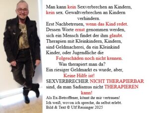 Dem Kind werden Ideologien geimpft, und plötzlich mit 25, 28 Jahren brechen die seelischen Wunden auf, das ist früh.Manche verdrängen, bis zu ihrem Ableben, da sie den Schmerz den man durchwandern muss, um sich vom Täter(n) zu lösen, sich dem Verbrechen an sich zu stellen, nicht in der Lage sind, da gebrochen, will man seinen Schmerz heilen!Diese entwürdigenden, entmenschlichten Situationen, das alles, was sie abhacken müssen, das verlorene nie mehr zurückgewinnende Urvertrauen, dieses verlorene Selbstwertgefühl, aufarbeiten müssen.